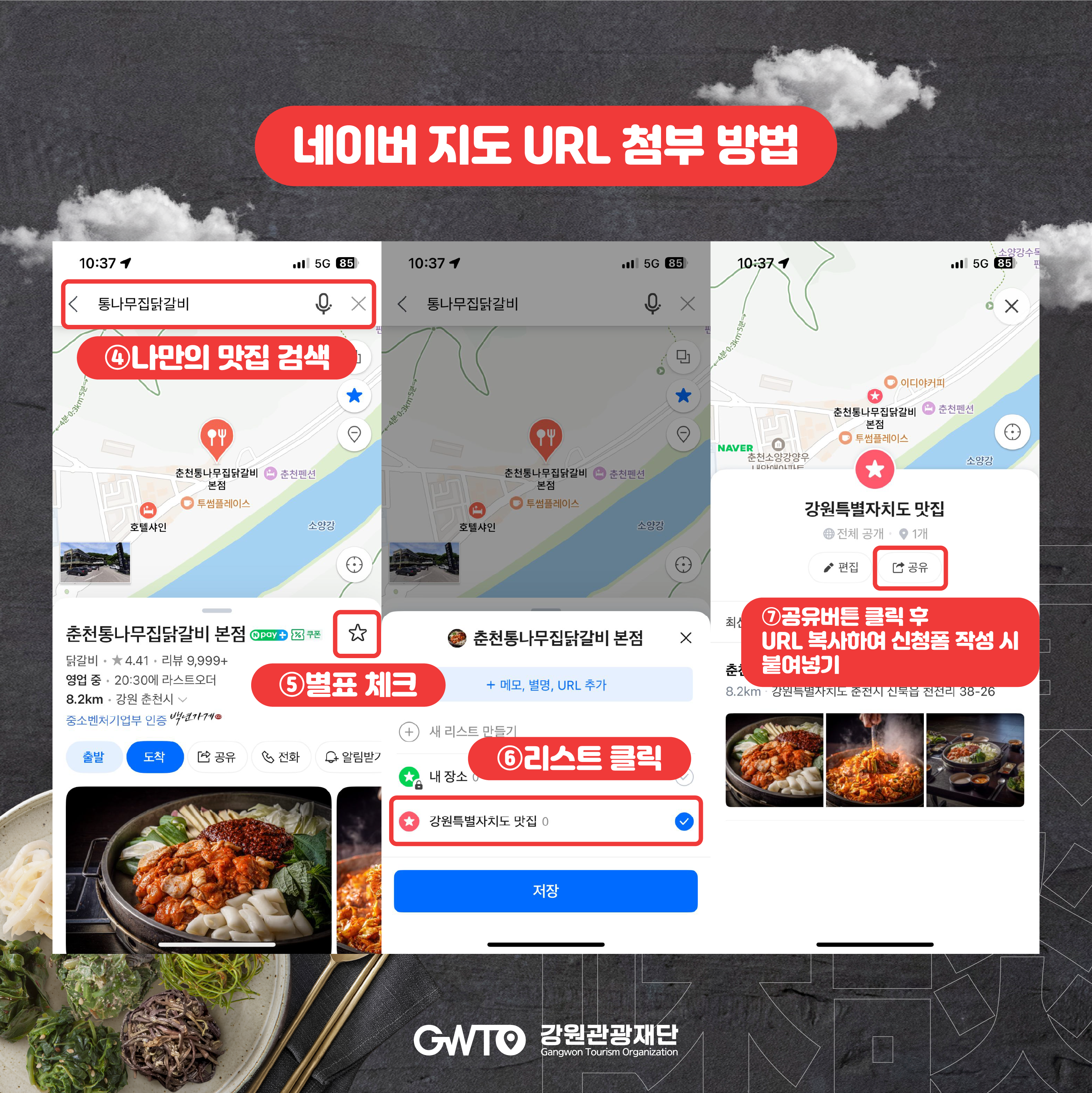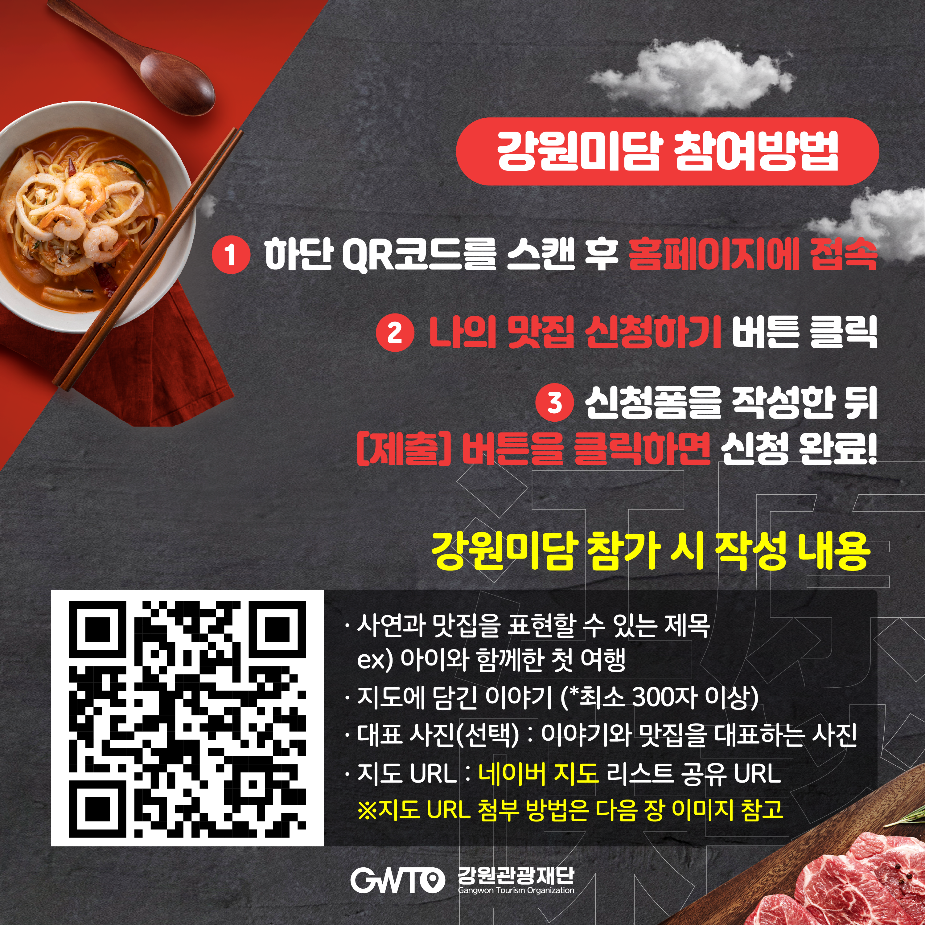 강원관광재단 국내관광팀입니다. 「2025 강원 미식 공유 챌린지, "강원미(味)담"」을 소개합니다. 2025-26 강원 방문의 해를 맞아 준비한 특별한 챌린지! 강원특별자치도 도민과 관광객이 함께 만드는 특별한 강원 맛집 지도, "강원미(味)담" 나만 알고 있었던 강원특별자치도의 찐 맛집 리스트 하나만 공유해도 경품 획득! ○ 참여기간: 2025. 11. 30.(일)까지 ○ 인증방법: - 카드뉴스의 QR코드 촬영 후, 홈페이지에서 참가 신청 / 또는 인증 홈페이지에서 참가 신청(https://gwfr.kr/) - 나의 맛집 신청하기 버튼 클릭! - 신청 폼 작성하기! (맛집과 스토리를 표현할 수 있는 제목 / 맛집 관련 에피소드 / 네이버 지도 리스트 공유 URL 링크 붙여넣기) - 제출 버튼을 클릭하면 신청 완료! 강원 미식 공유 챌린지에 많은 관심과 참여 부탁드리며, 강원 방문의 해를 맞이하여 준비한 경품들도 획득하시길 바랍니다! 바로 지금, 당신의 맛집을 알려주세요! 문의: 강원관광재단 국내관광팀 / 033-269-8981 |