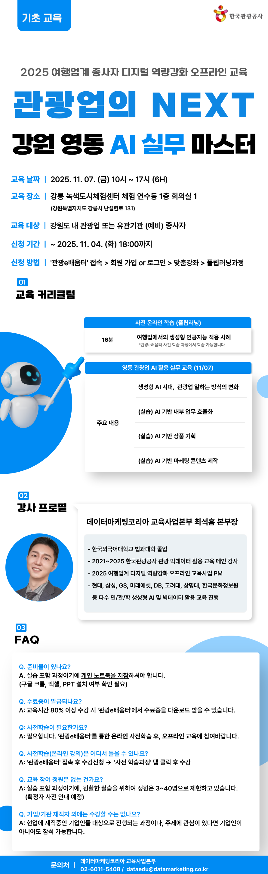 ○ 교육일시: 2025. 11. 7.(금) 10:00~17:00(6H) ○ 모집마감: 2025. 11. 4.(화) 18:00(정원 초과 시 조기 마감) ○ 교육장소: 강릉 녹색도시체험센터 체험 연수동 1층 회의실1 (강원특별자치도 강릉시 난설헌로 131) ○ 교육대상: 강원특별자치도 내 관광 유관 기업/기관 종사자(예비 종사자 포함) ○ 교육내용 - AI 시대, 관광업 일하는 방식의 변화 - AI 기반 내부 업무 효율화 -인공지능 챗봇- - AI 기반 상품 기획 -데이터 분석 및 관광상품 기획 - - AI 기반 마케팅 콘텐츠 제작 - 이미지, 영상, 음성, 제작 - ○ 교육강사: 데이터마케팅코리아 교육사업본부 최석흠 본부장 ○ 신청방법 1. 관광 E배움터 접속 → 회원가입/로그인 → 메뉴보기 → 맞춤강좌(플립러닝과정) → [오프라인] 강원 관광 AI 실무 마스터 2(기초) 2. 관광 E배움터 접속 → 회원가입/로그인 → 통합검색 → '[오프라인] 강원 관광 AI 실무 마스터 2(기초)' 검색 그 외 자세한 사항은 홈페이지 참고 바랍니다. |
